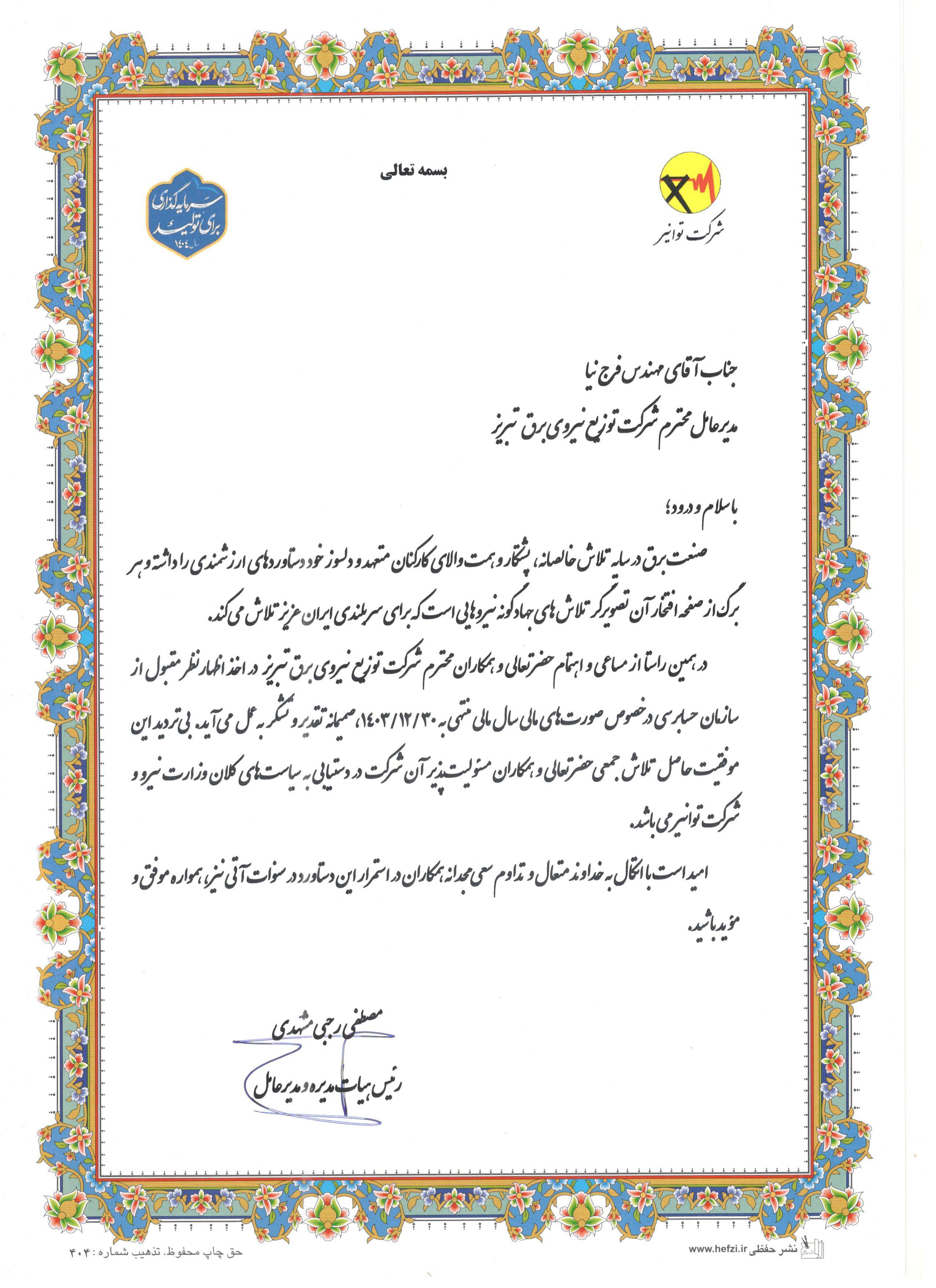 در همین راستا از مساعی و اهتمام حضرتعالی و همکاران محترم شرکت توزیع نیروی برق تبریز در اخذ اظهارنظر مقبول از سازمان حسابرسی در خصوص صورتهای مالی سال مالی منتهی به ۳۰/۱۲/۱۴۰۳ صمیمانه تقدیر و تشکر به عمل میآید.