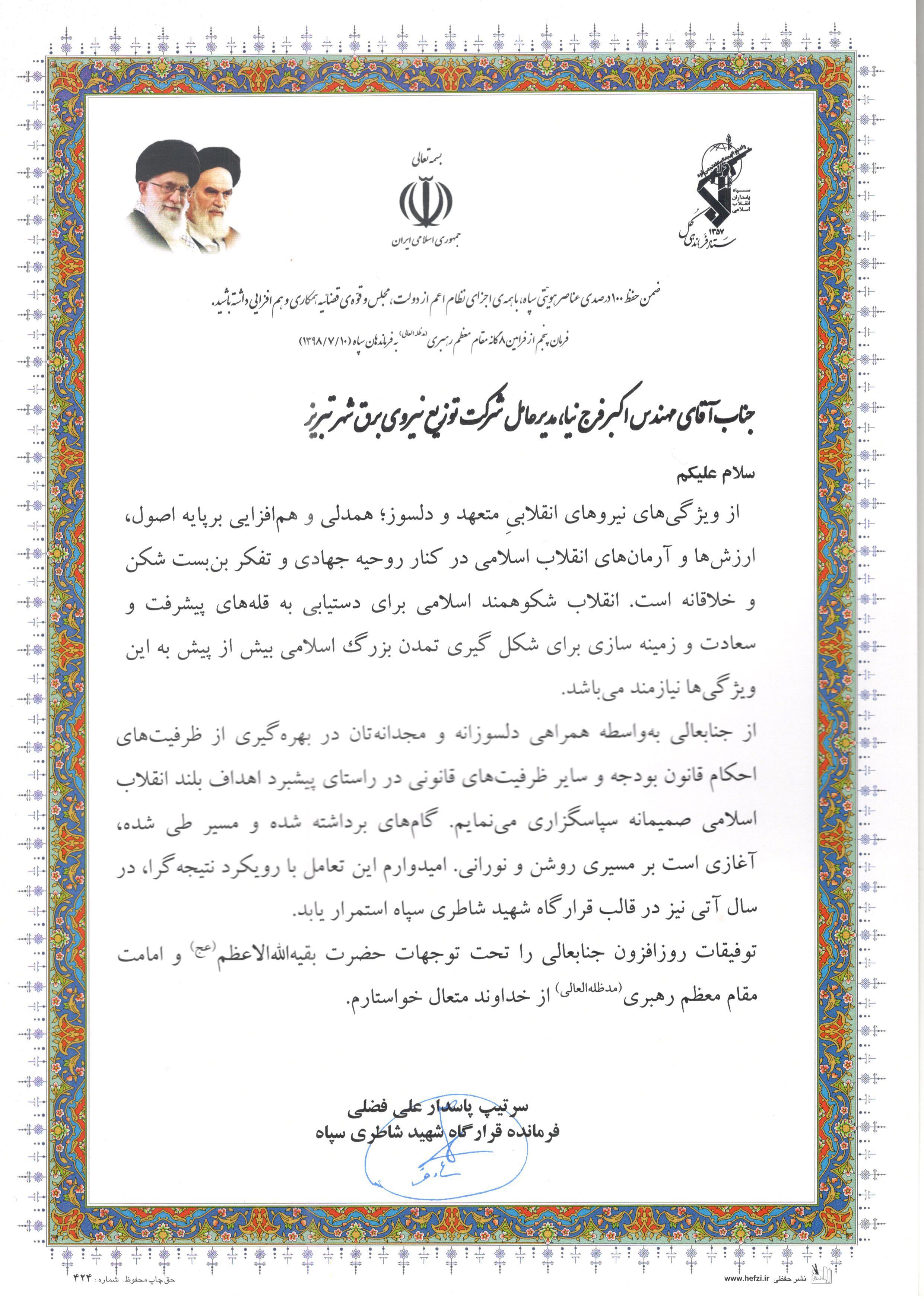 فرمانده قرارگاه شهید شاطری سپاه با ارسال لوحی از مدیرعامل برق تبریز در راستای تعامل و همکاری به منظور توسعه و پیشبرد اهداف آن فرماندهی قدردانی کرد.