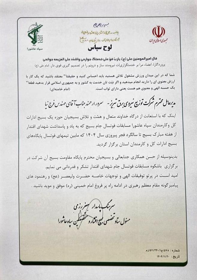 اینک که با استعانت از درگاه خداوند متعال و همت و تلاش بسیجیان حوزه یک بسیج ادارات کل و کارمندان سپاه عاشورا، مسابقات فوتسال جام بسیج به یاد و پاسداشت شهدای اقتدار، از هفته مبارک بسیج تا سالگرد فجر پیروزی در سال ۱۴۰۴، با حضور تیم‌های فوتسال پایگاه‌های بسیج ادارات کل و کارمندان استان برگزار شد، بدین‌وسیله از حسن همکاری جنابعالی و بسیجیان محترم پایگاه مقاومت بسیج آن شرکت در برگزاری هرچه باشکوه‌تر این مسابقات، تشکر و قدردانی می‌نمایم.
