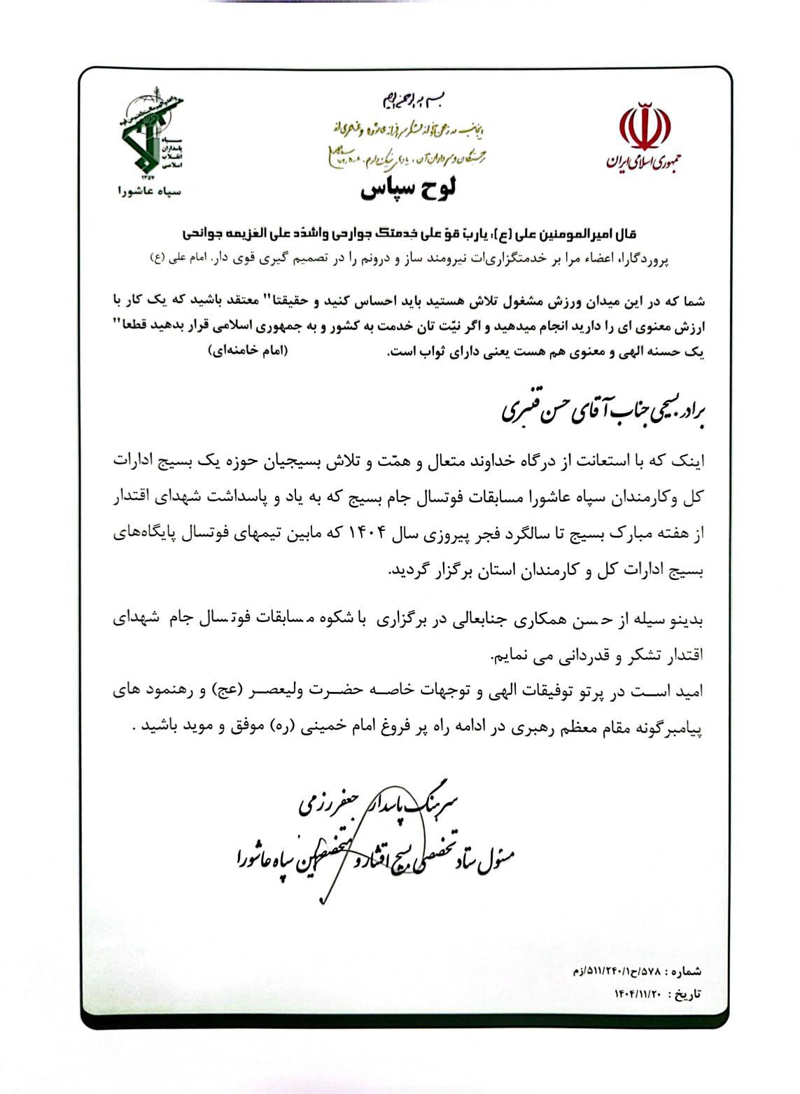 اینک که با استعانت از درگاه خداوند متعال و همت و تلاش بسیجیان حوزه یک بسیج ادارات کل و کارمندان سپاه عاشورا، مسابقات فوتسال جام بسیج به یاد و پاسداشت شهدای اقتدار، از هفته مبارک بسیج تا سالگرد فجر پیروزی در سال ۱۴۰۴، با حضور تیم‌های فوتسال پایگاه‌های بسیج ادارات کل و کارمندان استان برگزار شد، بدین‌وسیله از حسن همکاری جنابعالی و بسیجیان محترم پایگاه مقاومت بسیج آن شرکت در برگزاری هرچه باشکوه‌تر این مسابقات، تشکر و قدردانی می‌نمایم.
