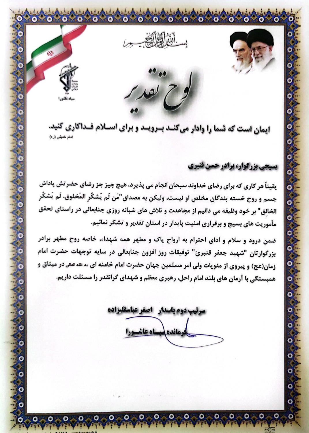 ضمن درود و سلام و ادای احترام به ارواح پاک و مطهر همه شهداء خاصه روح مطهر برادر بزرگوارتان "شهید جعفر قنبری" توفیقات روز افزون جنابعالی در سایه توجهات حضرت امام زمان (عج) و پیروی از منویات ولی امر مسلمین جهان حضرت امام خامنه ای مد ظله العالی در میثاق وهمبستگی با آرمانهای بلند امام راحل رهبری معظم و شهدای گرانقدر را مسئلت داریم